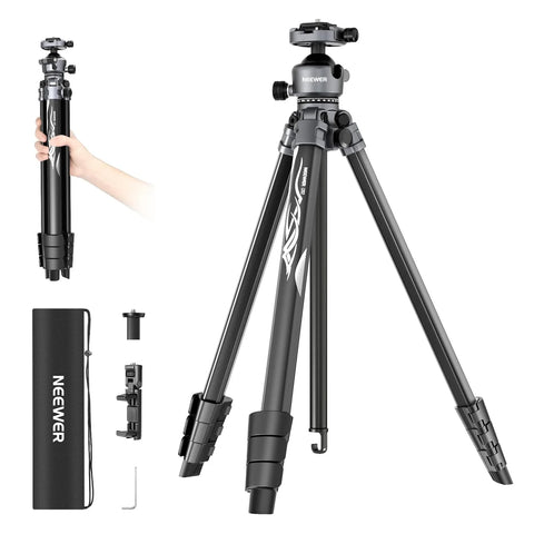 Su diseño portátil permite plegarlo hasta 52 cm de largo y 5,7 cm de diámetro, facilitando el transporte con una sola mano. Las patas de 4 secciones ofrecen un rango de altura de 48,5 cm a 156,5 cm, con tres ángulos de apertura (22°, 55° y 85°) para adaptarse a cualquier terreno. Las patas de goma antideslizantes aseguran máxima estabilidad.